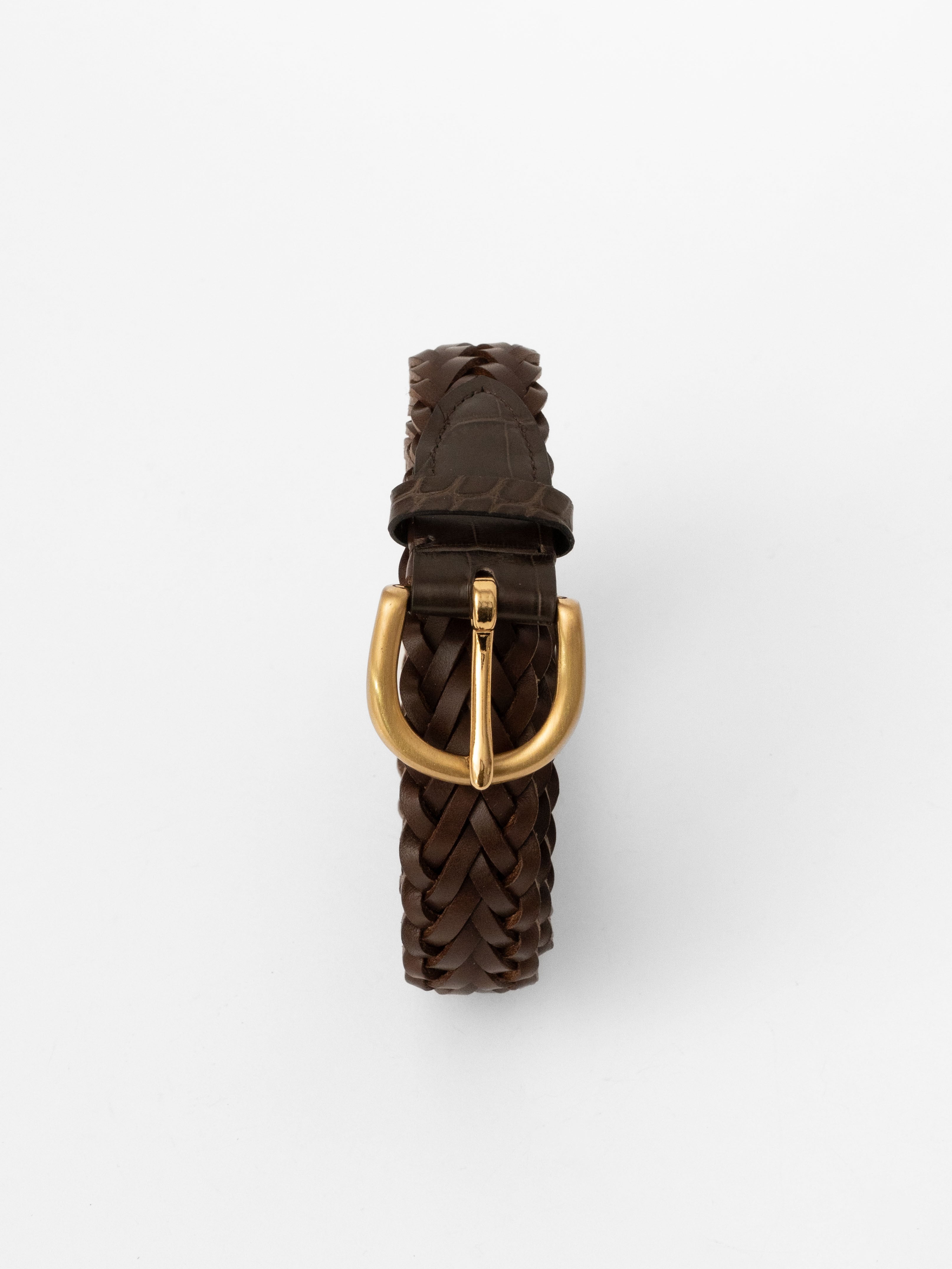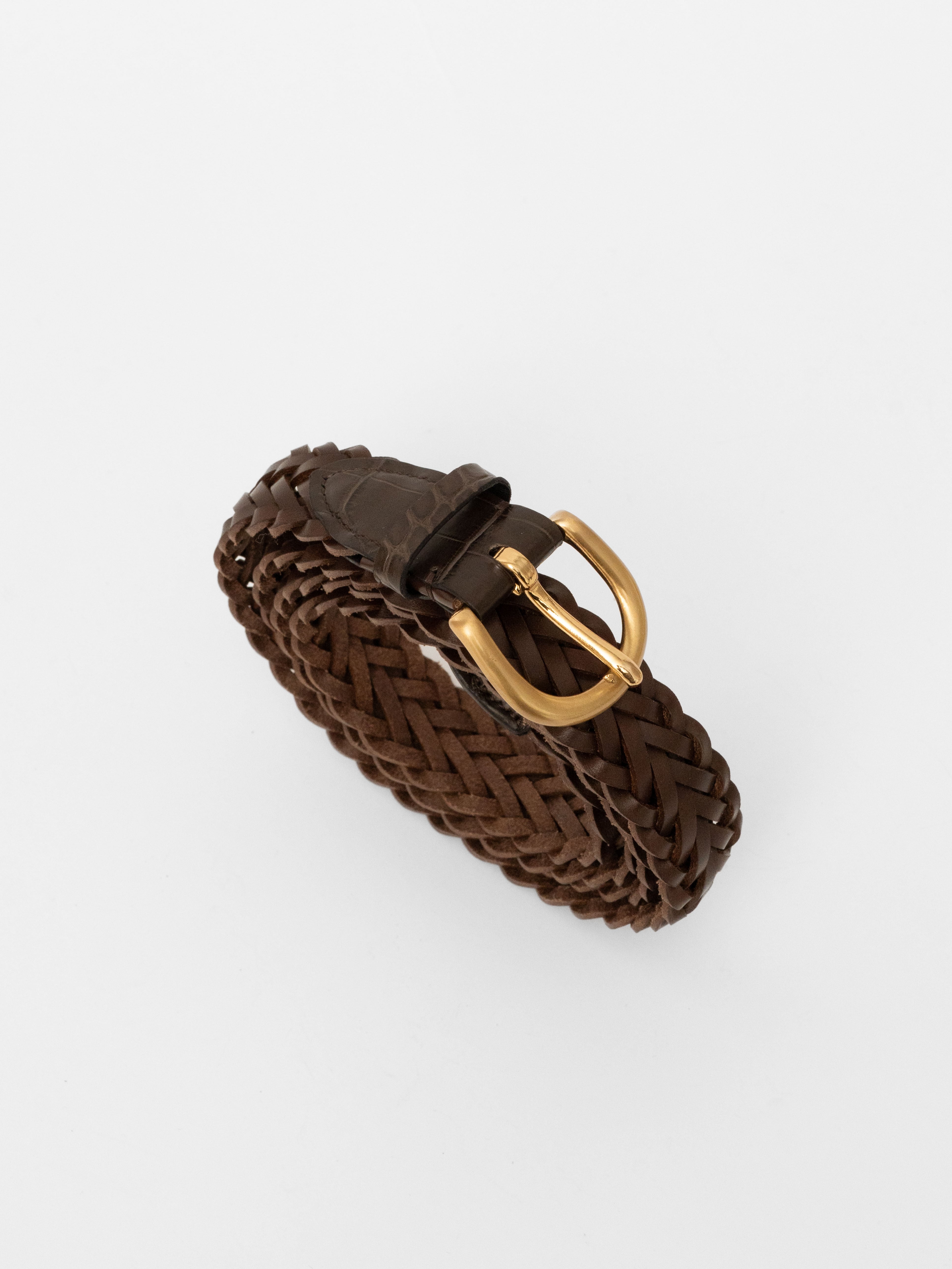 しっかりとした厚みのあるイタリアンレザーを手作業で密度高く編み上げたベルト。剣先とバックル部分には、あて革を手縫いで取り付けています。このあて革にはお好みのレザーをお選びいただけます。バックルの色も数種類から選択可能。仕立ての細部に好みを反映できる一本です。